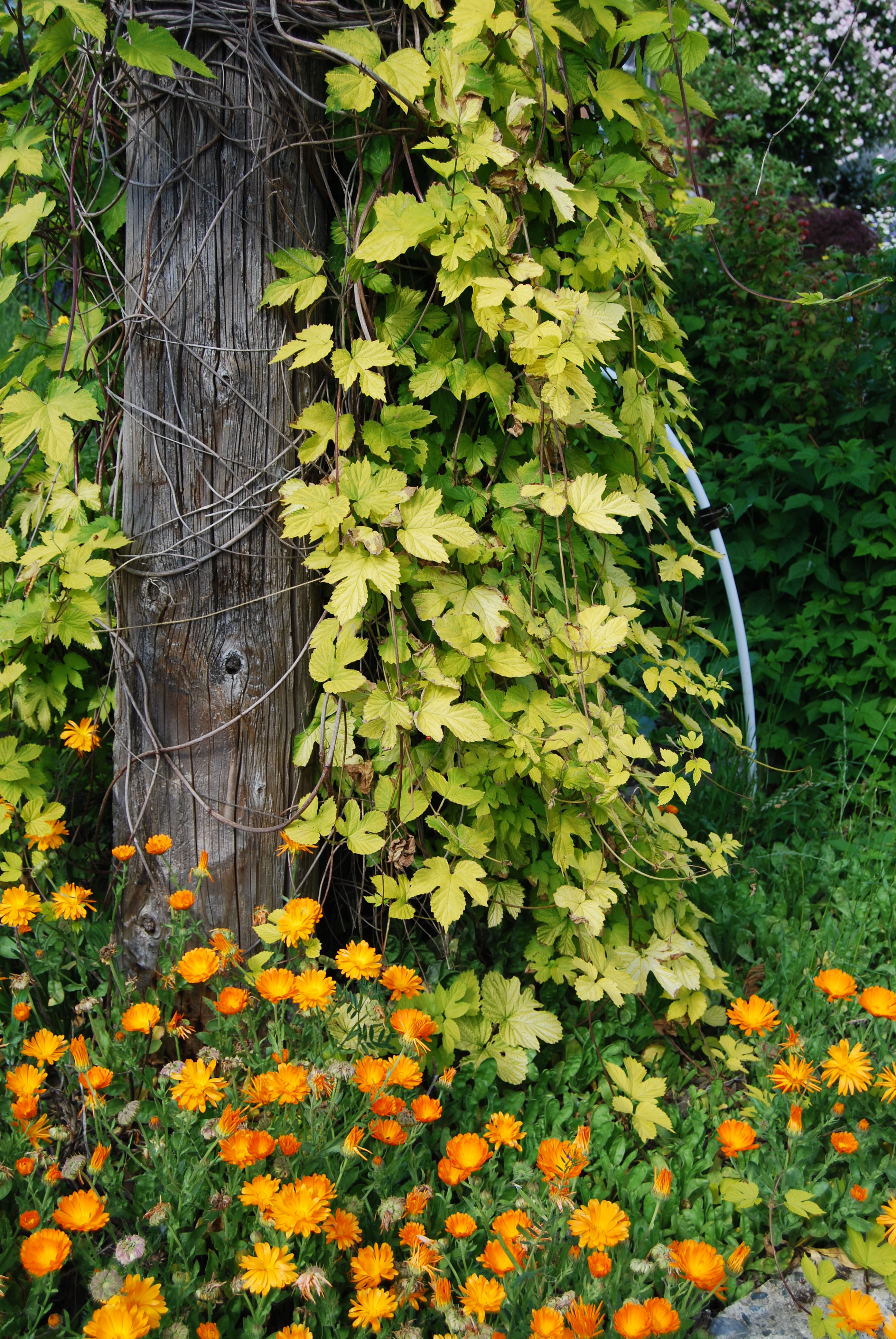 The hops is getting tall and the calendula flowers are ready to be harvested and dried.
