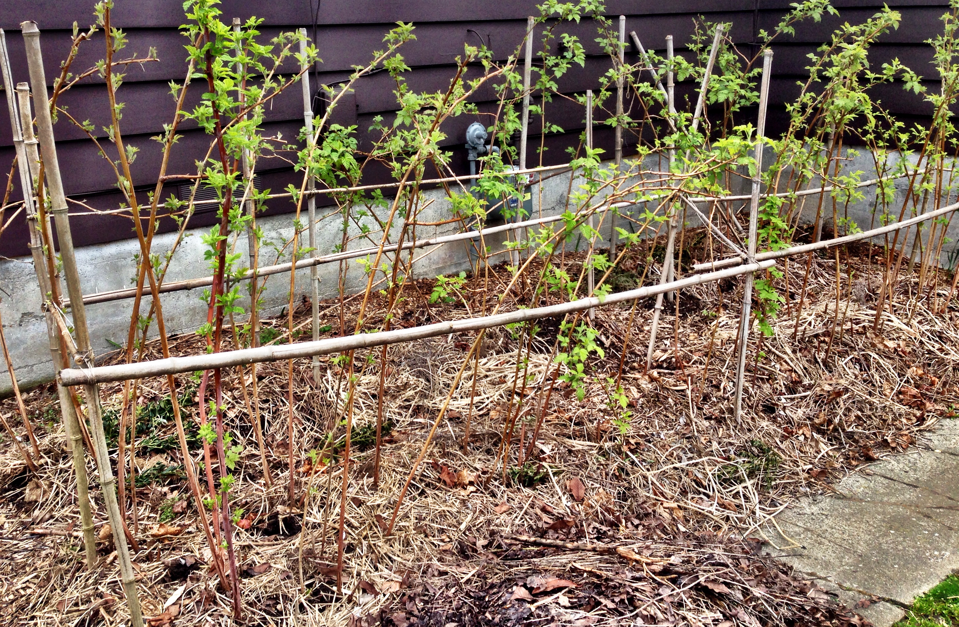 Bambood trellised raspberry canes.