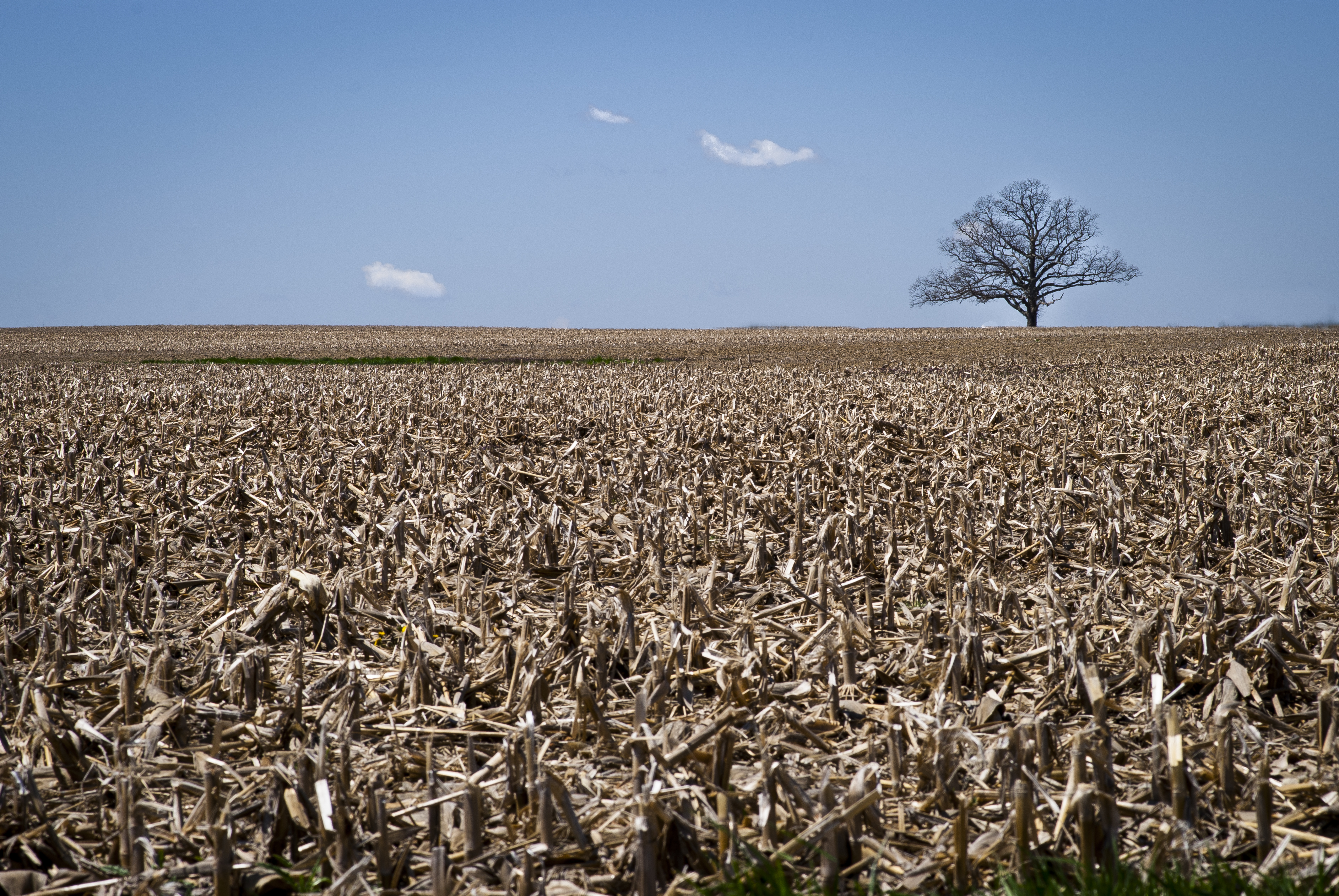 Corn stalks from last year cover the fields.