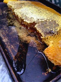 One frame of honey oozing honey on a tray.