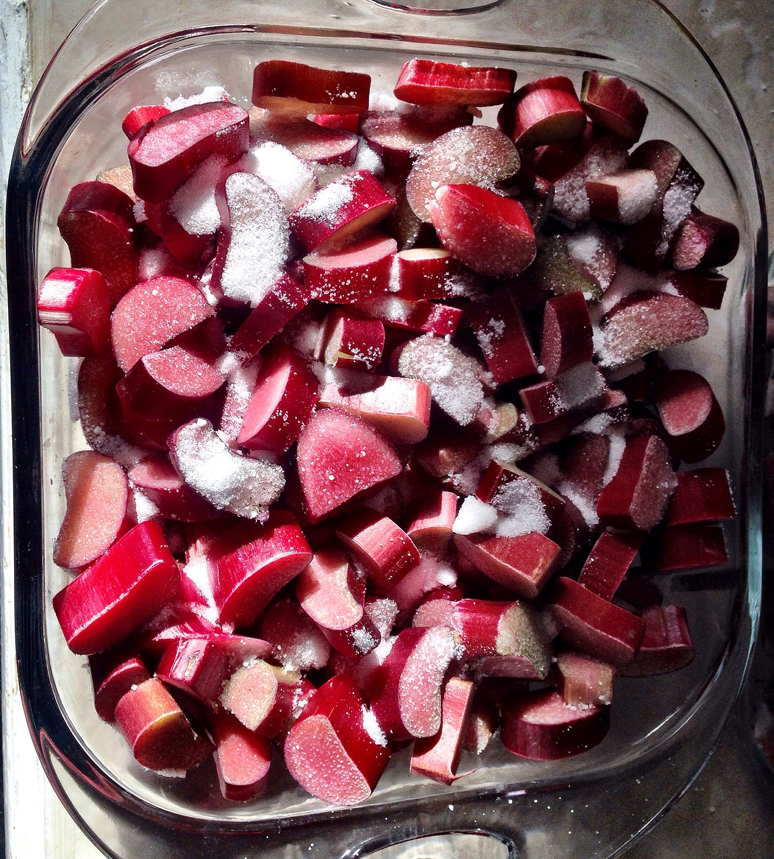 Cut rhubarb with tapioca and sugar sprinkled.